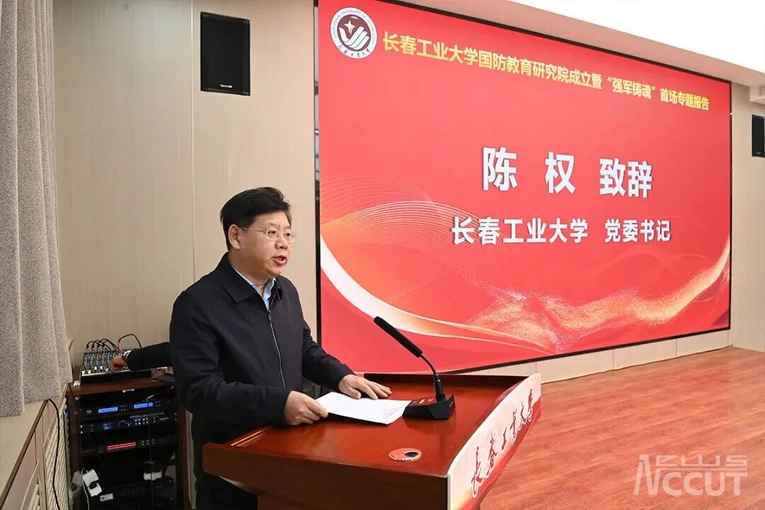 陈权在致辞中指出,成立国防教育研究院是学校深入学习贯彻习近平强军思想和习近平总书记关于加强全民国防教育的重要论述,主动服务国家战略需求,将国防教育深度融入立德树人全过程的关键举措,标志着学校国防教育工作迈向体系化、学理化的新发展阶段。研究院要致力于打造理论研究新高地、铸牢人才培养主阵地、建设决策咨询强智库,为巩固国防、服务军队现代化建设贡献“工大智慧”。